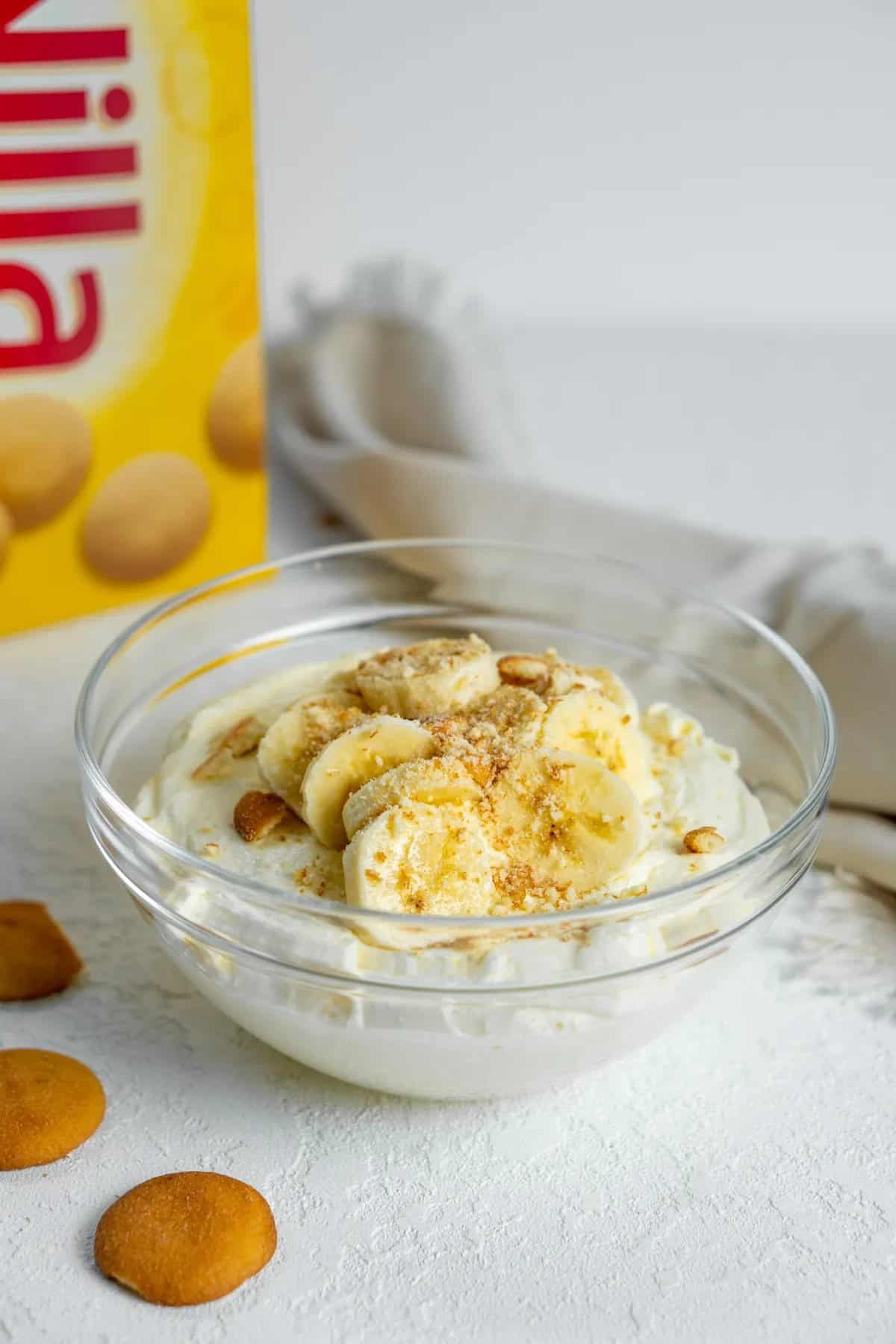 1 Add whip, yogurt, cream cheese and pudding mix to a bowl and mix thoroughly with a hand mixer. 4 Place the dip in a bowl to serve and top with freshly chopped bananas and crumbled Nilla Wafers.You can put this dip into single serve containers in the fridge for meal prep or serve as one big dip everyone can enjoy. I would suggest you leave the toppings until ready to enjoy.View original recipe