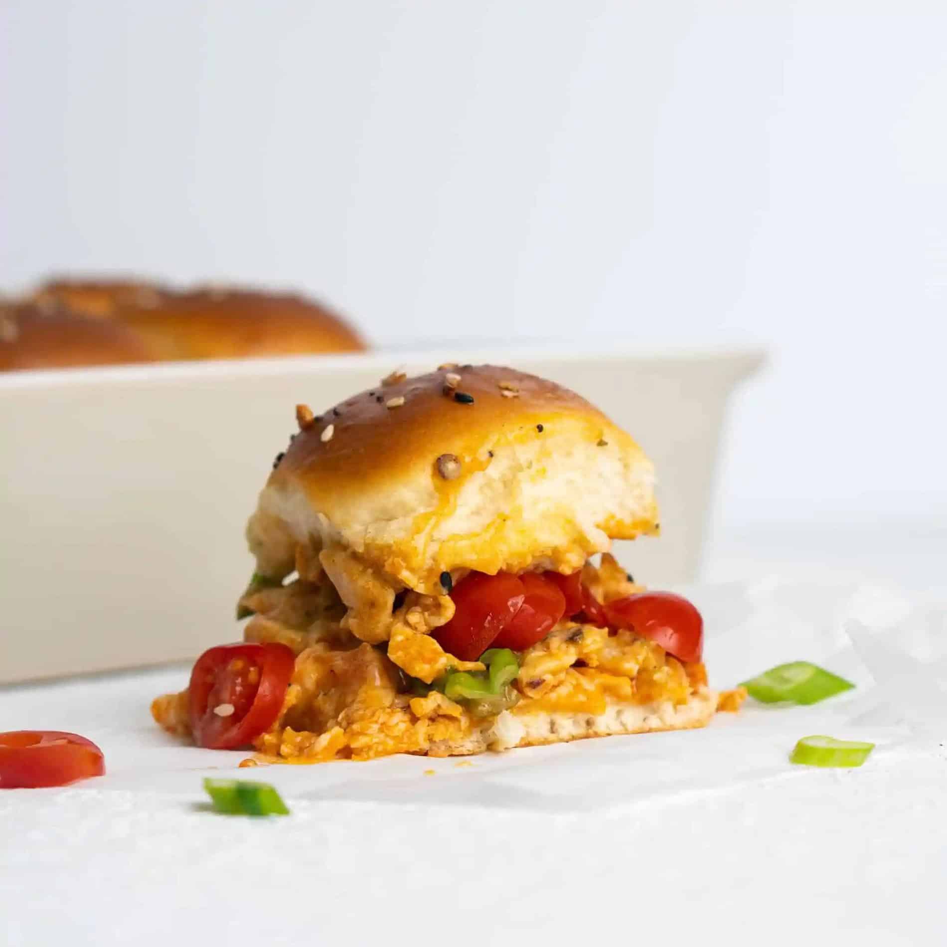 1 Pre heat oven to 350.In a pan over medium cooked buffalo shredded chicken until cooked through. 4 Spray a baking dish with nonstick cooking spray. Slice the rolls in half and place the bottom of the 12 rolls in the baking dish. 5 Top rolls with cooked chicken and cheese. Place tops back on the rolls. Spray tops with cooking spray and sprinkle sesame seeds or everything but the bagel seasoning. Bake at 350 F for 15 minutes. 6 When the rolls are toasted and browned pull out of the oven and remove the tops. Top with warmed queso, salsa and chopped green onions. You can add chopped cherry tomatoes here or with each individual slider.View original recipe