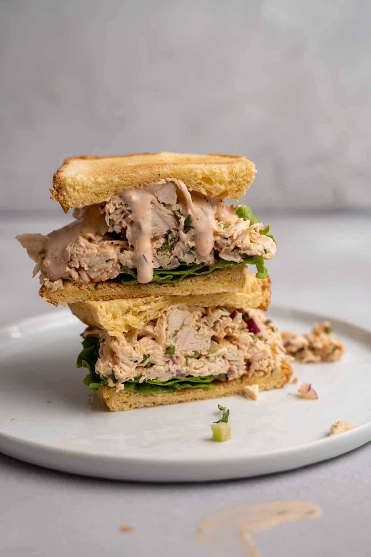1 In a small bowl whisk together the almond milk, dairy-free yogurt, lemon juice, Dijon mustard, minced garlic, dried dill, dried parsley, onion powder, salt and pepper until smooth and creamy. Leave as is for ranch dressing and add the hot sauce to make it into buffalo ranch sauce. 2 Taste the dressing and adjust seasonings as needed. Transfer dressing to a jar or airtight container and refrigerate for at least 30 minutes to allow flavors to blend. 3 Add the raw chicken to a pot and cover with enough water to cover the top of the chicken. 4 Bring to a boil over high heat. Once boiling, lower heat to medium. Let the chicken boil for 20 minutes or until cooked through and no longer pink. Once cooked, remove the chicken from the water and shred with 2 forks. 5 In a medium bowl, combine the shredded chicken, buffalo ranch dressing, celery, red onion, parsley, chives, salt and pepper. Mix everything well to combine. 6 Toast your bread or use lettuce cups in place of bread. Place a lettuce leaf on the bottom half of each bread slice, if using. Spoon the buffalo ranch chicken salad on top. Serve immediately with some extra dressing. 7 Optional: You can add sliced tomatoes, avocado, or bacon to your sandwich for added flavor and texture.View original recipe