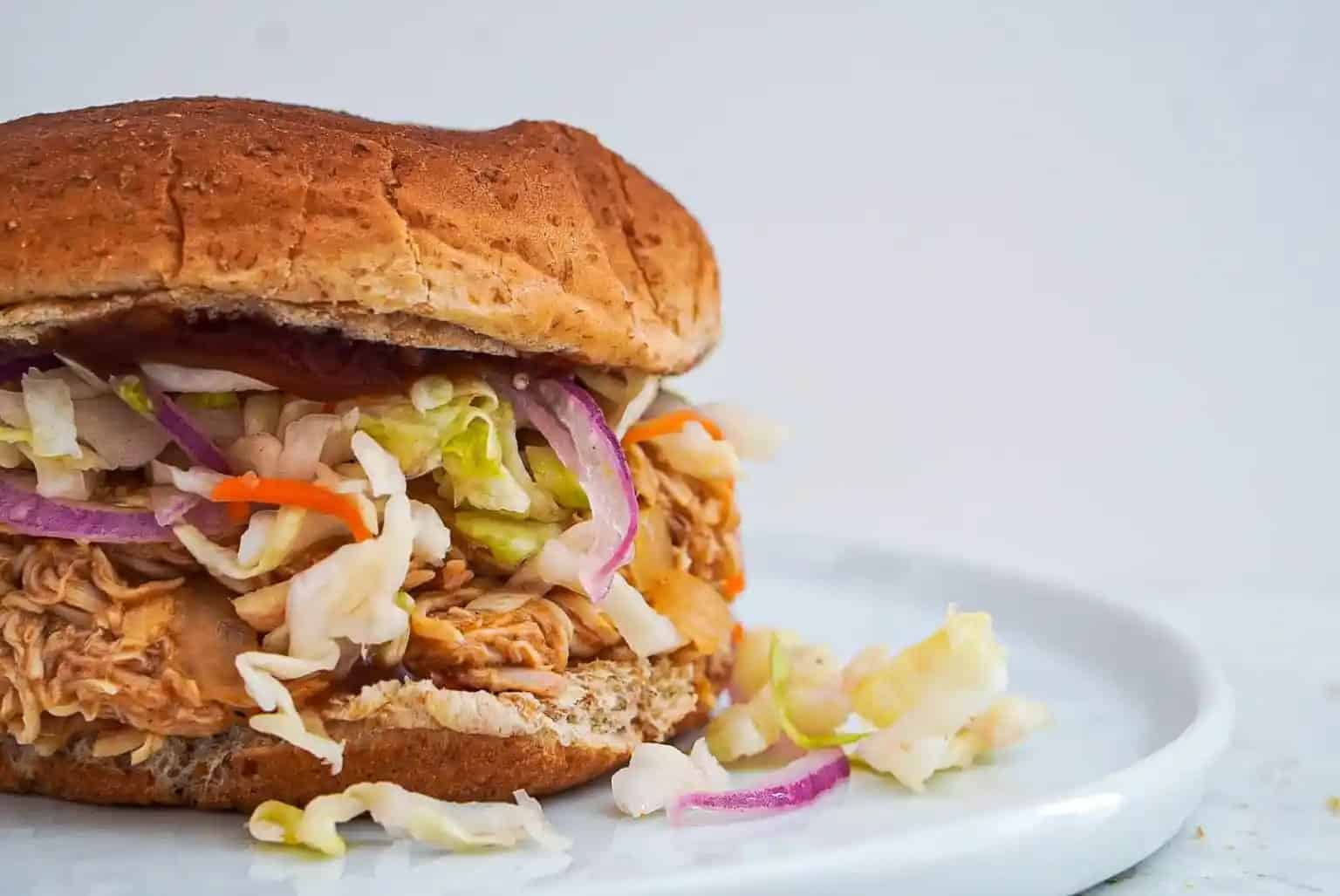 Chicken Instructions 1 Line the crockpot with onions and top with raw chicken. Season with salt and pepper to taste. Top chicken with BBQ sauce. 7 Cover and cook on low for 4-6 hours or high for 3. 9 Once done cooking shred the chicken directly in the crockpot and mix together. Serve on buns with coleslaw. Coleslaw Instructions 10 Mix all coleslaw mix, onion, lime juice, salt and pepper together in a bowl and place in the fridge for at least an hour before serving. The lime will marinate the onions and leave a nice crispy tangy flavor to complement the meat. View original recipe