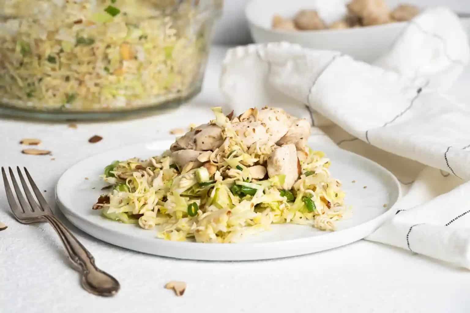 1 In a food processor shred and grate the cabbage. Add to a large mixing bowl.Pre heat oven to 350. Layer sliced almonds on a baking sheet and place in the oven for 3-7 minutes until toasted but not burnt. 4 While the almonds toast, chop onions and add to cabbage along with sesame seeds.Place dry ramen noodles in a zip top bag and crush until it's in bite size pieces. Add to cabbage mixture. 5 Remove almonds from the oven and add to the cabbage salad.Mix all dressing ingredients in a mason jar or salad container and shake to mix thoroughly. 6 Add dressing to cabbage salad and mix well to evenly coat. Serve with grilled chicken breast for protein.View original recipe