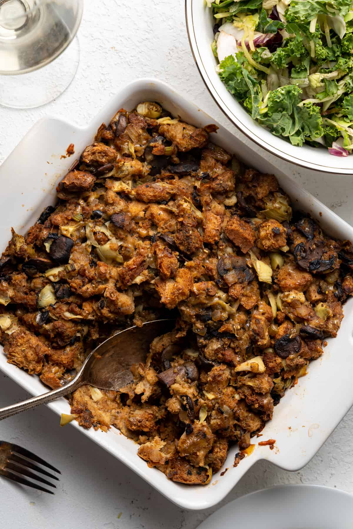 For the bread cubes 0 Slice the bread into bite sized chunks leaving the crust on. Place on a baking sheet, you may need to use two, and bake for 15 minutes at 350 degrees Fahrenheit. Shake the baking sheet and place back in the oven for 10 minutes. For the stuffing 2 While the bread bakes add 2 tbsp. of butter to a large pan over medium. Once melted add garlic, onion, celery and mushrooms. Cook on medium high stirring often for approximate 15-20 minutes until the mixture is golden brown. 4 Add 1/3 cup chicken stock to the mushrooms mixture and scrape up all the browned bits from the bottom of the pan using a wooden spoon. 5 Add the mixture to a large mixing bowl along with the dried bread cubes, cheese, seasonings and chopped artichoke hearts. Toss to evenly mix. 6 In a separate bowl whisk together to remaining 2 cups of chicken stock and 2 eggs. Pour on top of the stuffing mixture. Mix together to get everything evenly coated with the broth mixture. 7 Place the stuffing in a 8x8 baking dish and bake covered with foil for 30 minutes at 350 degrees Fahrenheit. Uncover and bake an additional 20 minutes. Serve and enjoy!View original recipe