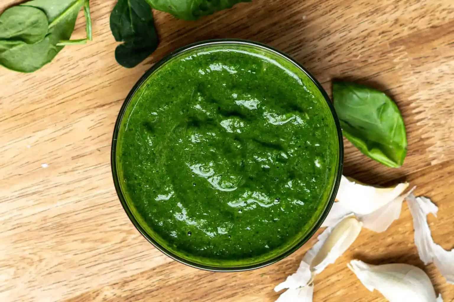 Skip the dairy, nuts and oil and try this simple Oil Free Pesto. I love a good Oil Free Pesto and the flavors it adds to pastas, wraps and pizzas. I was determined to figure out a pesto that didn’t break the macro bank but gave me everything I craved. This pesto does the trick. It’s garlicky and lemony and packs a punch. Try it on your next pizza, sandwich, wrap or mix it with some laughing cow wedges and make a creamy pasta.