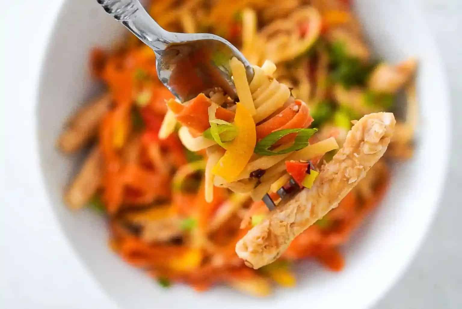 1 Cut raw chicken into strips and cook in a pan over medium heat seasoned with salt and pepper until cooked through. 4 Cook 2 oz linguini according to package. 5 Prepare peanut sauce by mixing all ingredients together in a bowl. When 1 minute left on the noodles add the veggies to the boiling pot. 6 Drain noodles and veggies. Place in a bowl, top with chicken and peanut sauce and mix.Top with green onions, red pepper flakes and toasted sesame seeds.View original recipe