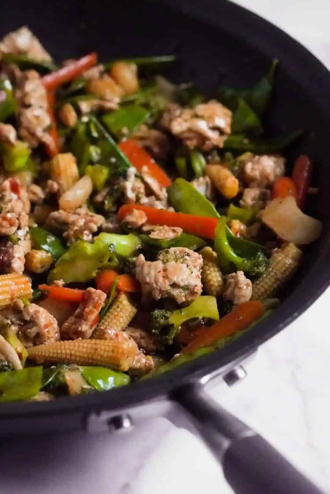 1 Heat a pan over medium heat and spray with nonstick cooking spray. 8 Add turkey to the pan. I like to smash the turkey down into the pan, season with salt and pepper and let it brown on each side prior to breaking into pieces. Season with salt and pepper and brown. 9 Once turkey is cooked through add broccoli, carrots, 1/4 cup of water and steam the veggies until slightly soft, stirring frequently. Once the carrots begin to soften add corn, peas, water chestnuts, crushed red pepper to taste and fresh cracked pepper. 10 Add stir-fry sauce and chili garlic sauce. Mix together well and serve over rice.For a low carb option serve over zoodles, Healthy Noodles or riced cauliflower.View original recipe